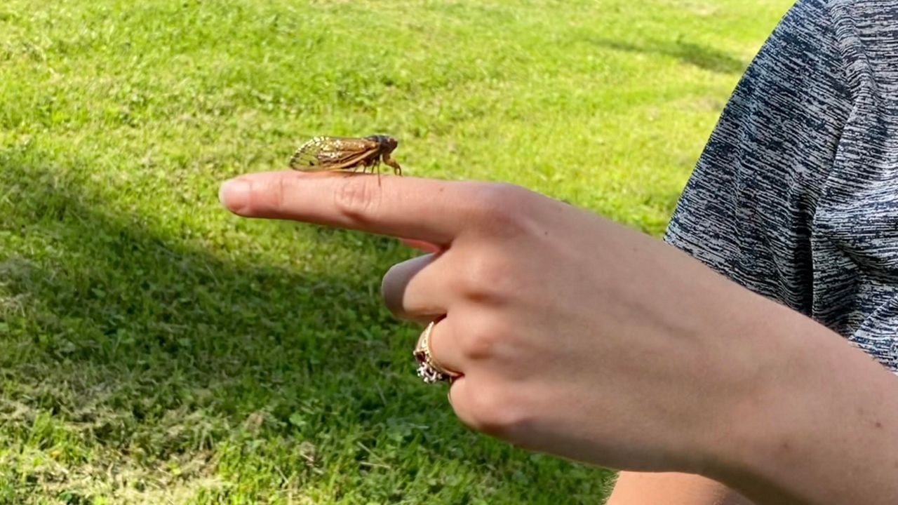 Homan holds one of her "friendly" cicadas (Sam Knef/Spectrum News 1)